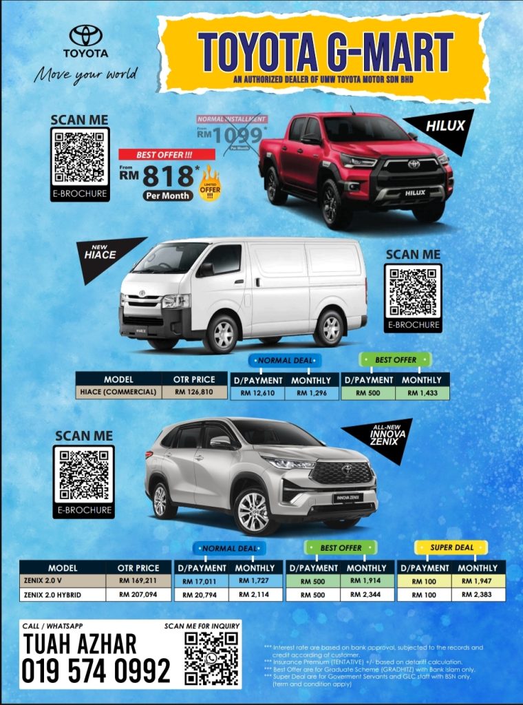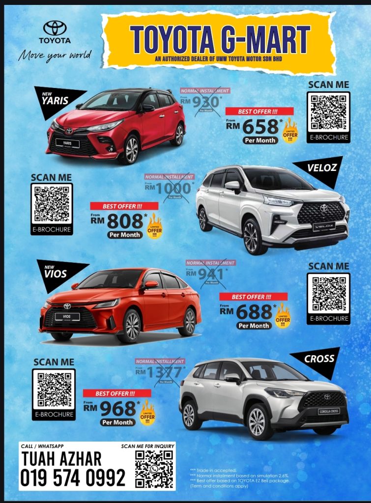 Hubungi saya segera untuk maklumat terkini mengenai promosi Toyota. Saya berjanji untuk membantu anda menguruskan pembelian kereta anda dengan pantas dan profesional.